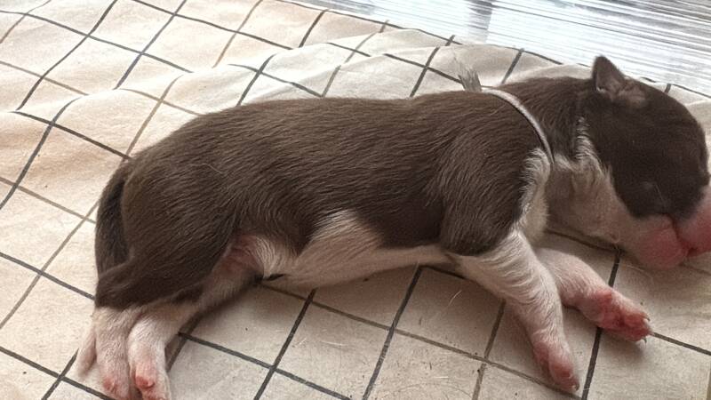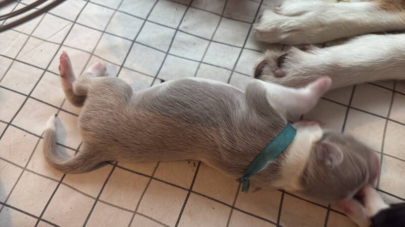 Om 14:28 een lilac merle teefje van 370 gram, fuchsia bandje. We zijn helemaal blij, in een klap weten we dat hij bruin draagt en ook verdunning!