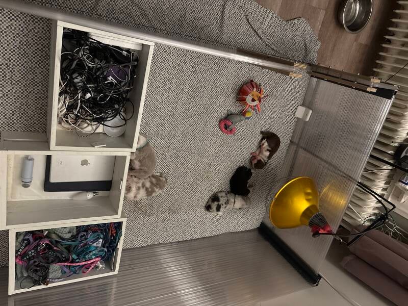 Donderdag 2 okt Vanmorgen kwamen marley en lily weer gezellig bij ons liggen, was ook bijna tijd om op te staan. De pups werden snel wakker toen het licht aan ging. Er was heel veel geplast op de mat en er vlak voor. Eerst de grote honden uit gelaten en daarna eerst de bak gedaan. Ik moet zo werken dus laat ze maar in de bak vandaag, vanmiddag komt Willem dus dan kunnen ze mooi even los. Ik heb paar keer op de app gekeken en ze sliepen vooral, geen idee of Lily vaak gevoed heeft. Bodine is thuis en ook Kian komt regelmatig even beneden eten. Uit mijn werk kwam Willem even bij de dames kijken. Ze werden net wakker. Dat is toch leuker dan alleen een slapende pup. De fuchsia is veel minder pieperig, springt in het rond en als je met je hand op de grond tikt komt ze gelijk kijken. De lila is ook echt rustiger geworden, kijkt het allemaal van een afstandje aan en mengt zich er dan in. Frank zat Pip al even over de rand hangen dus de extra verhoging wordt al bijna te laag. Ik ga ze nu elke dag aan de ren laten wennen dan kunnen we volgende weekje kist opruimen. Voor nu is het nog wel lekker dat ik in de nacht op de camera precies de bak in beeld heb. In de avond mochten ze weer even spelen inde ren, Lily voedde ze daar ook. Ze bleven wel beetje pieperig en zeuren daarna, heb het gevoel dat ze hongerig worden.